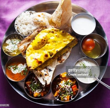 Tasty Thali – A wholesome Indian meal featuring 4 soft chapatis, comforting dal, one rich curry sabji, one flavorful dry sabji, creamy raita, and fragrant rice. A perfect balance of taste, nutrition, and tradition — all served together for a satisfying, homely experience.